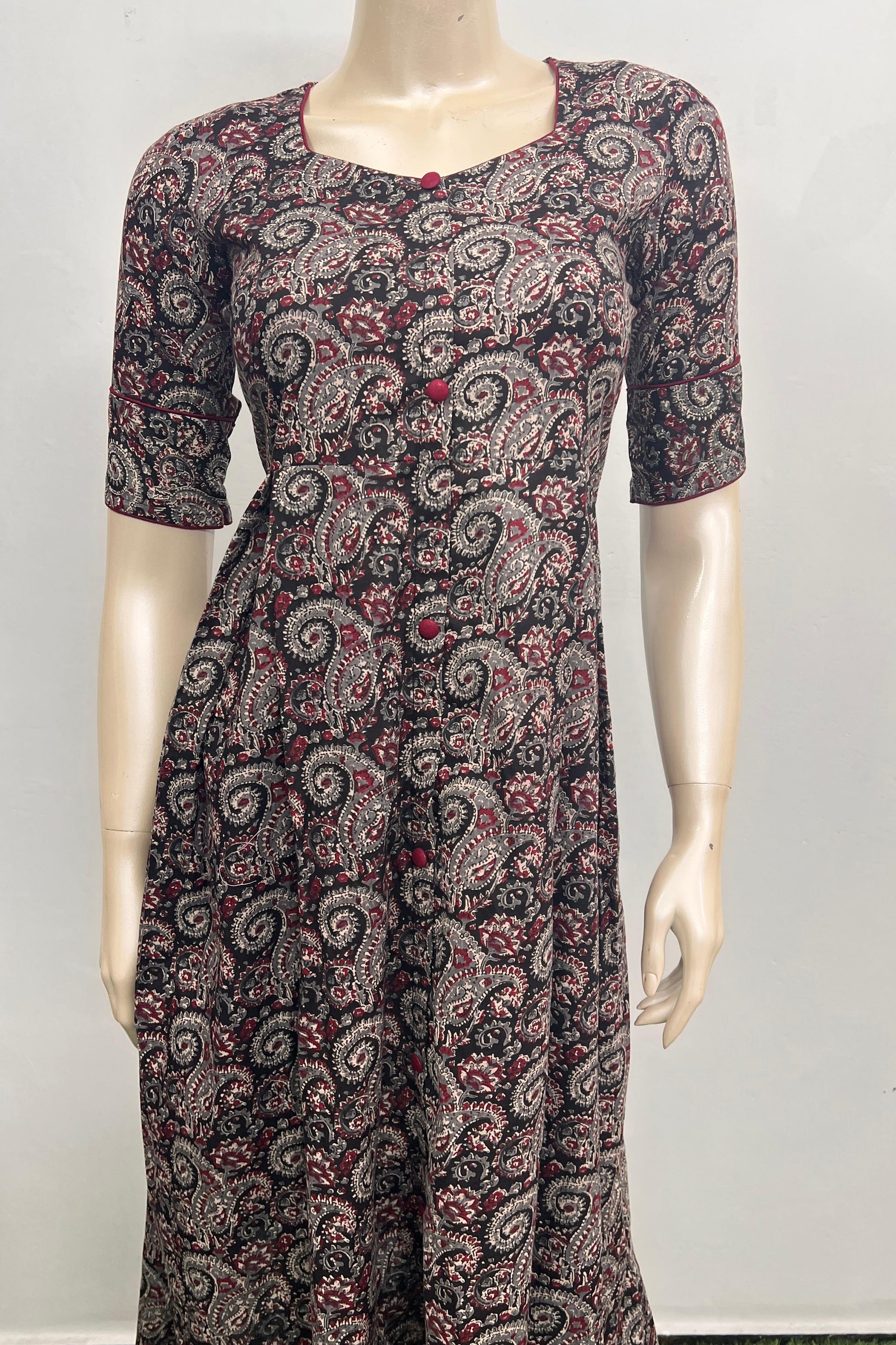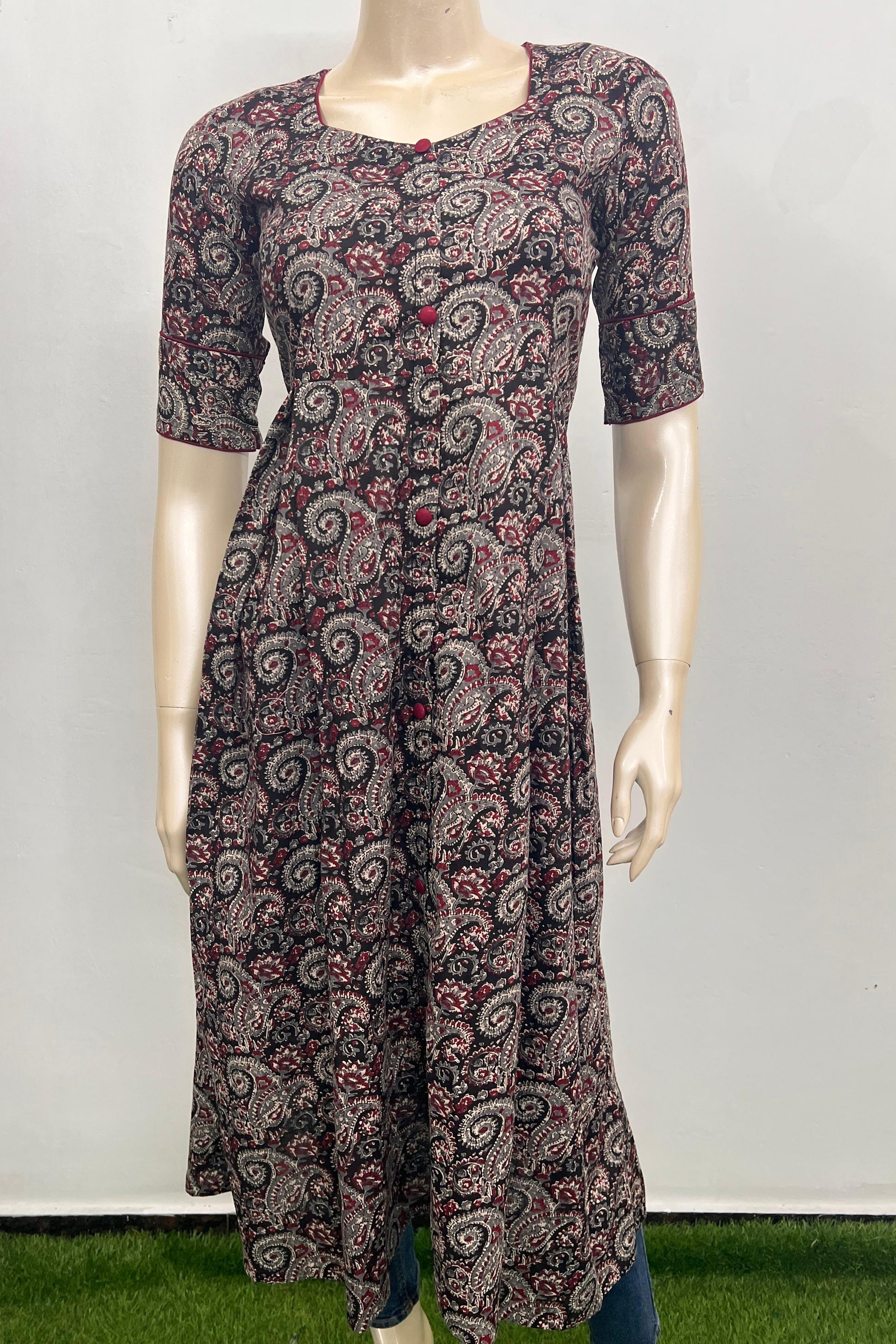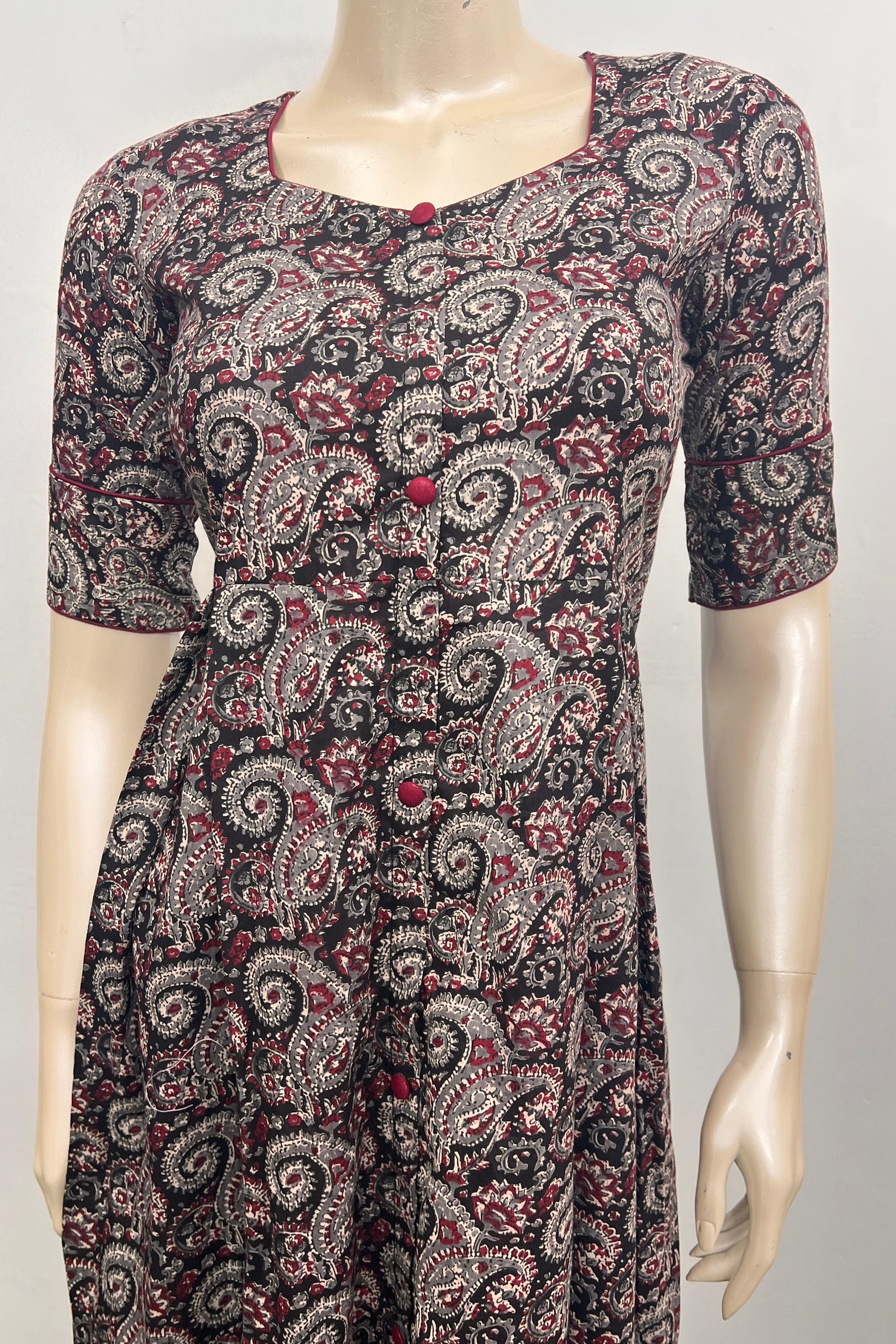 Cotton dress kurti with a beautiful busy floral paisley design with box pleat. It has a squared neckline and elbow sleeve, highlighted with maroon piping and button. It is made in pure cotton making it breathable and comfortable.