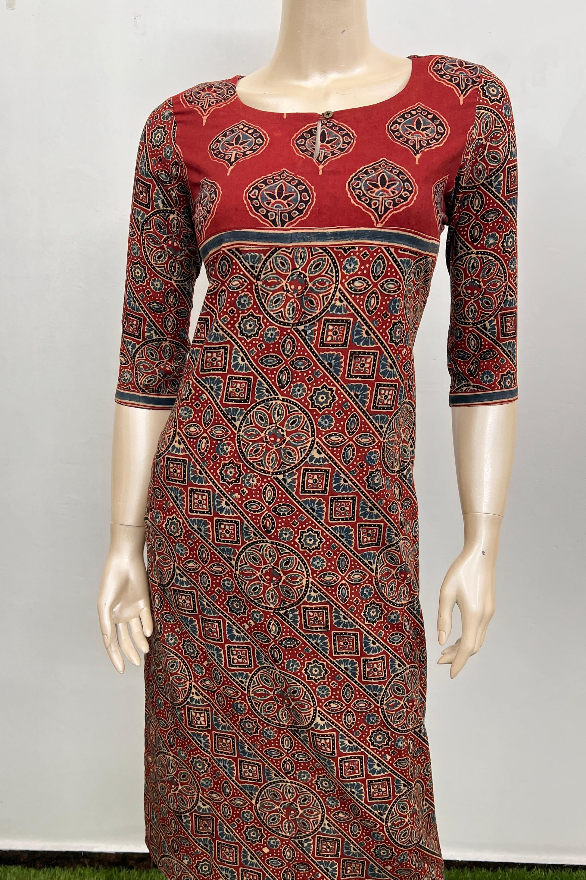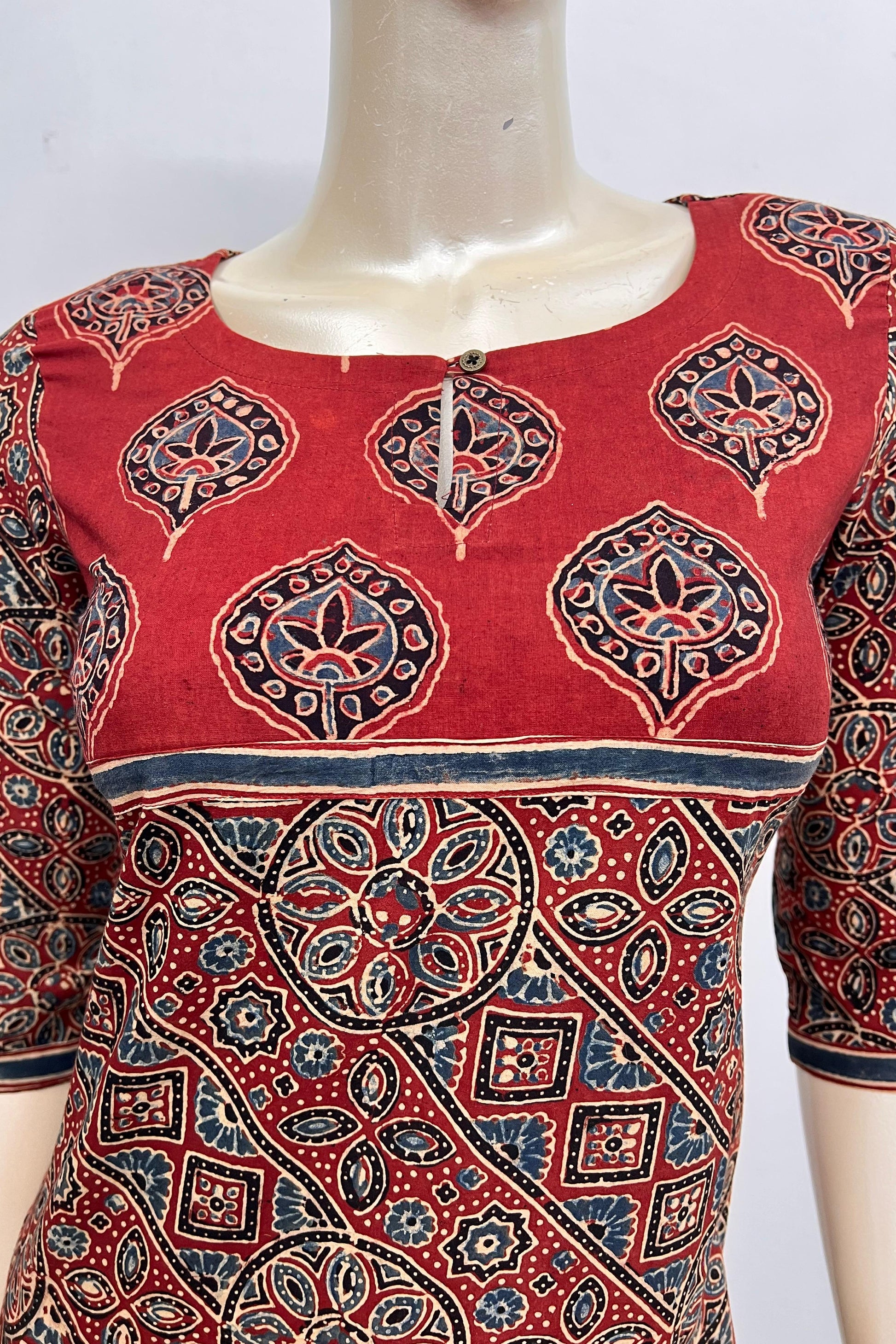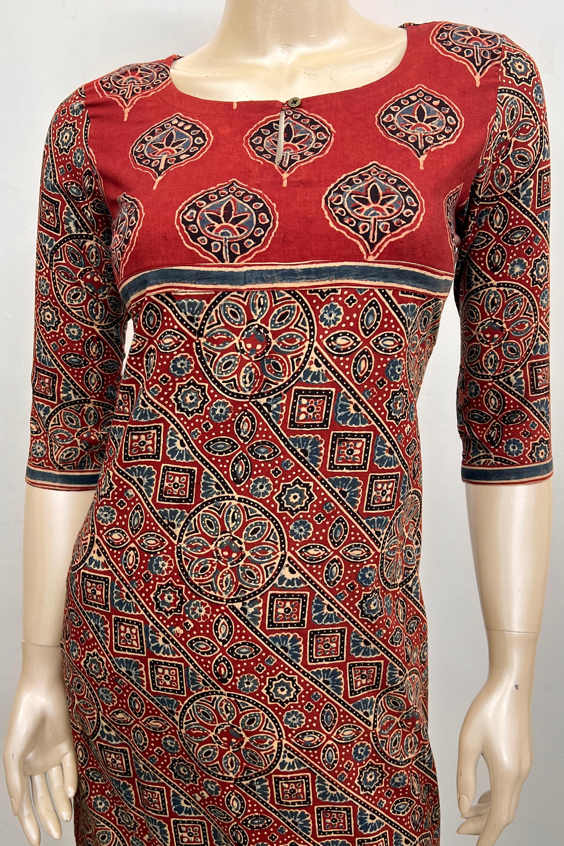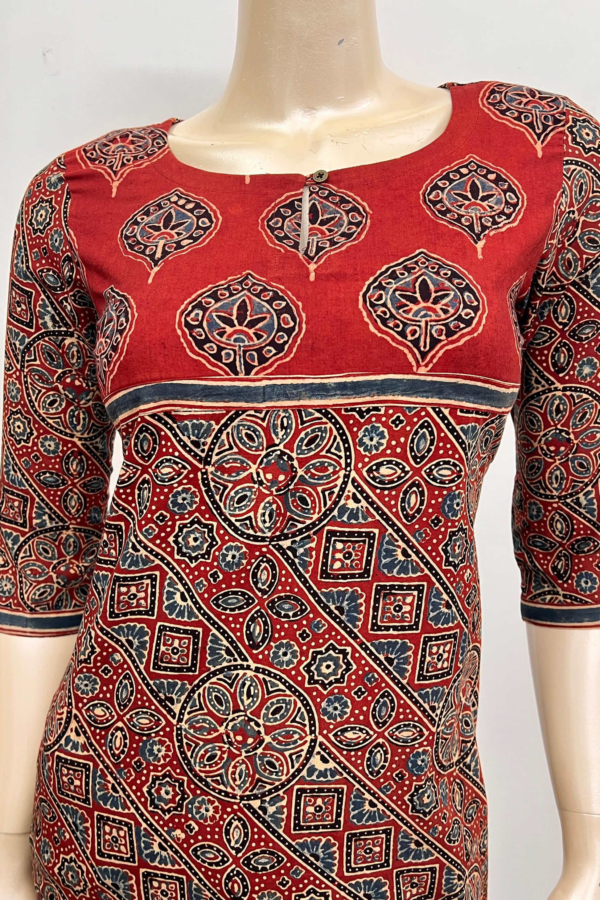Handblock Ajrakh printed kurti in a deep reddish maroon colour with traditional intricate geometrical and floral motifs in a colour combination of black, offwhite, and tints of blue. It has a rounded neckline with a cut highlighted in loop & button , It is made in pure cotton making it breathable and comfortable.