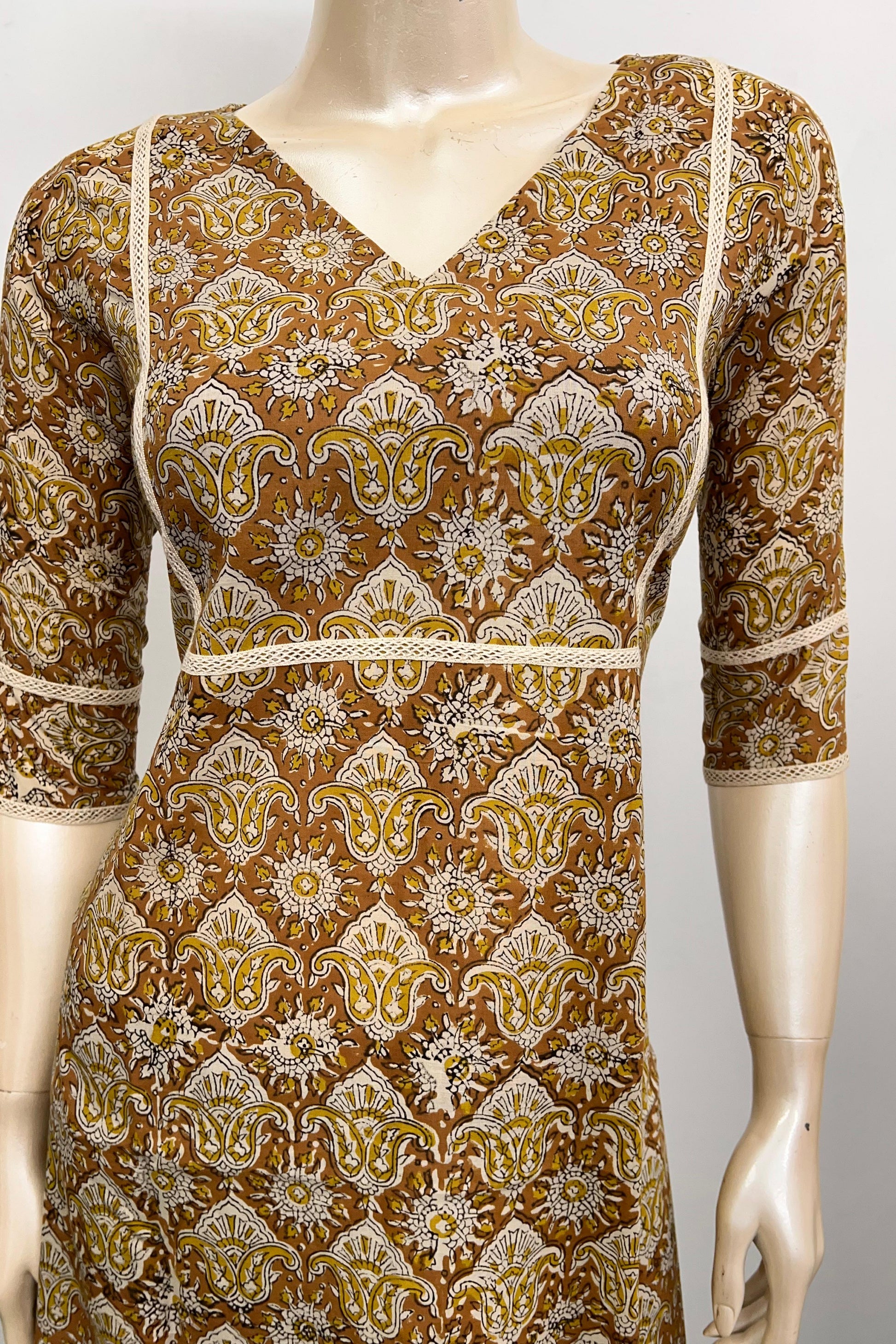 The dress features a repeating traditional style block print kurti in shades of brown, mustard yellow, and offwhite. It is an A - line silhouette with a cream coloured lace detail along the V neckline and the cuffs , It is made in pure cotton making it breathable and comfortable.
