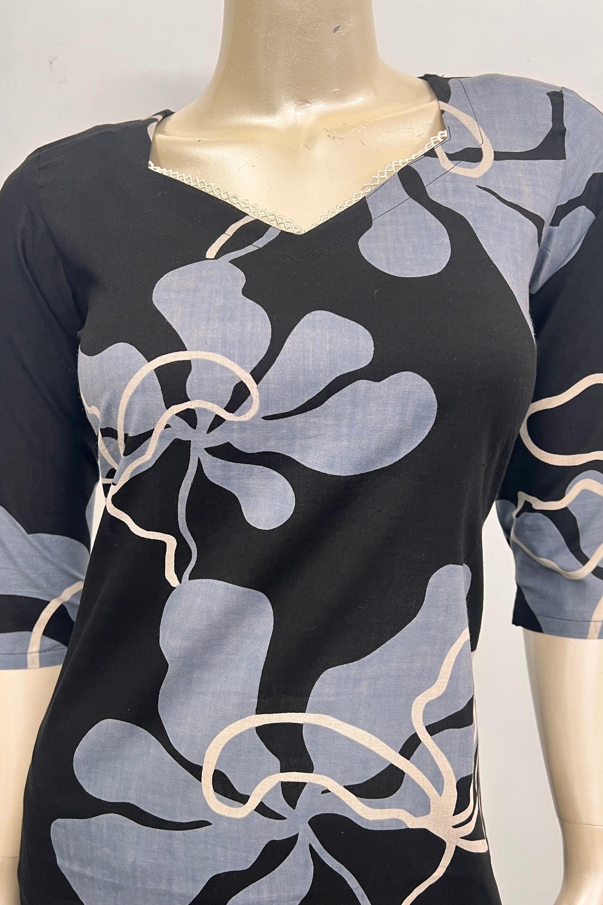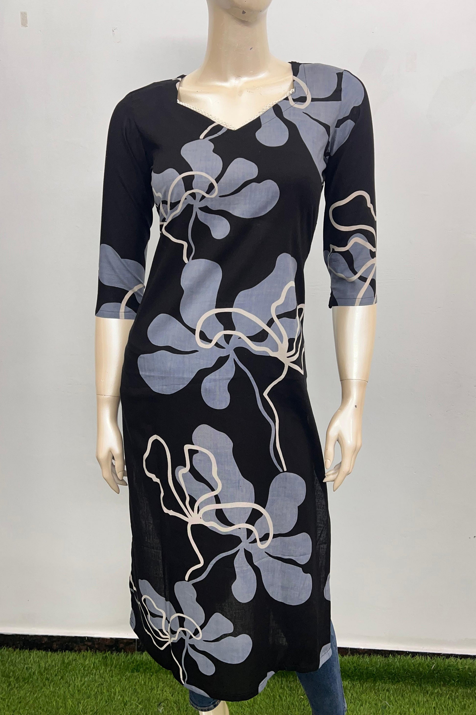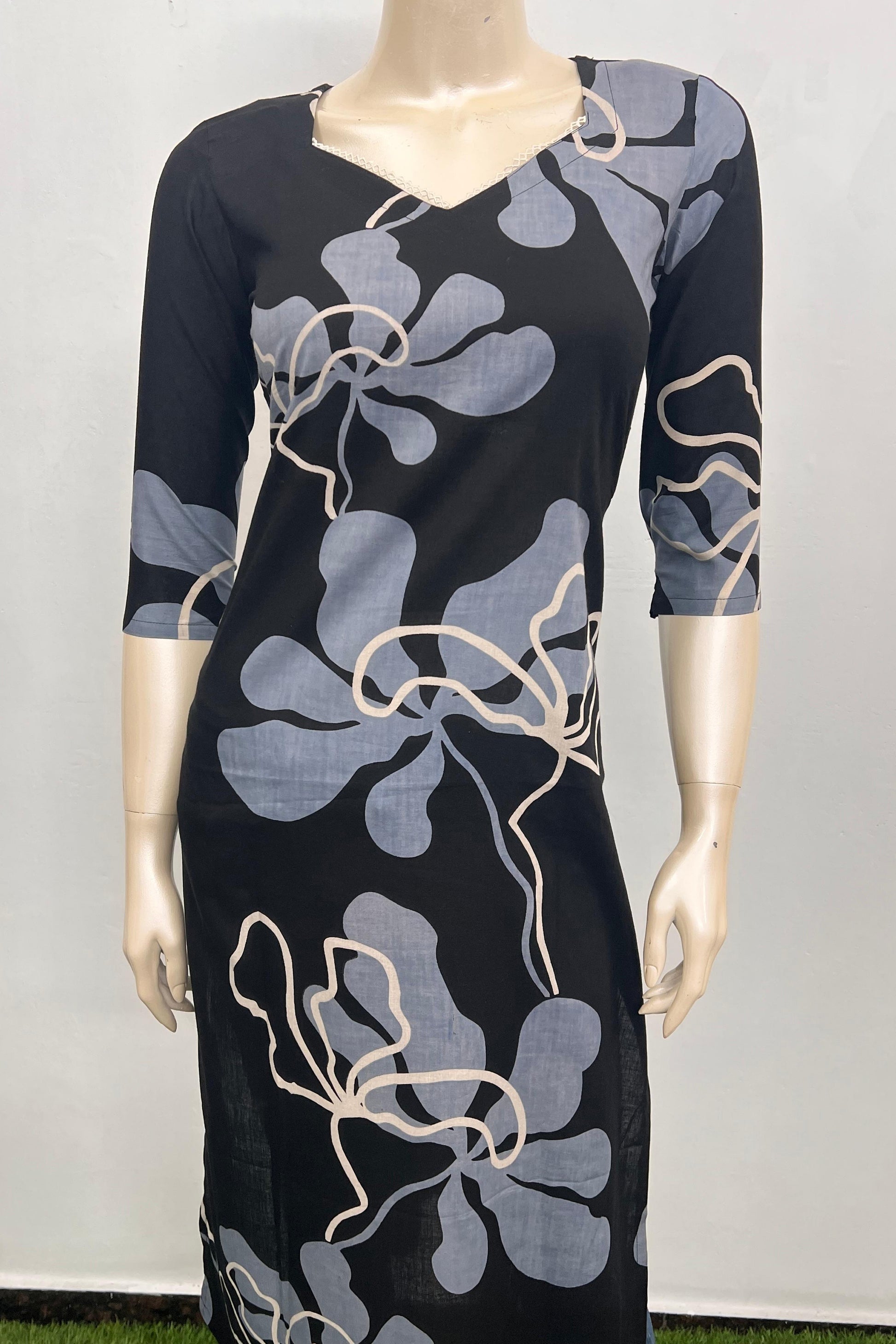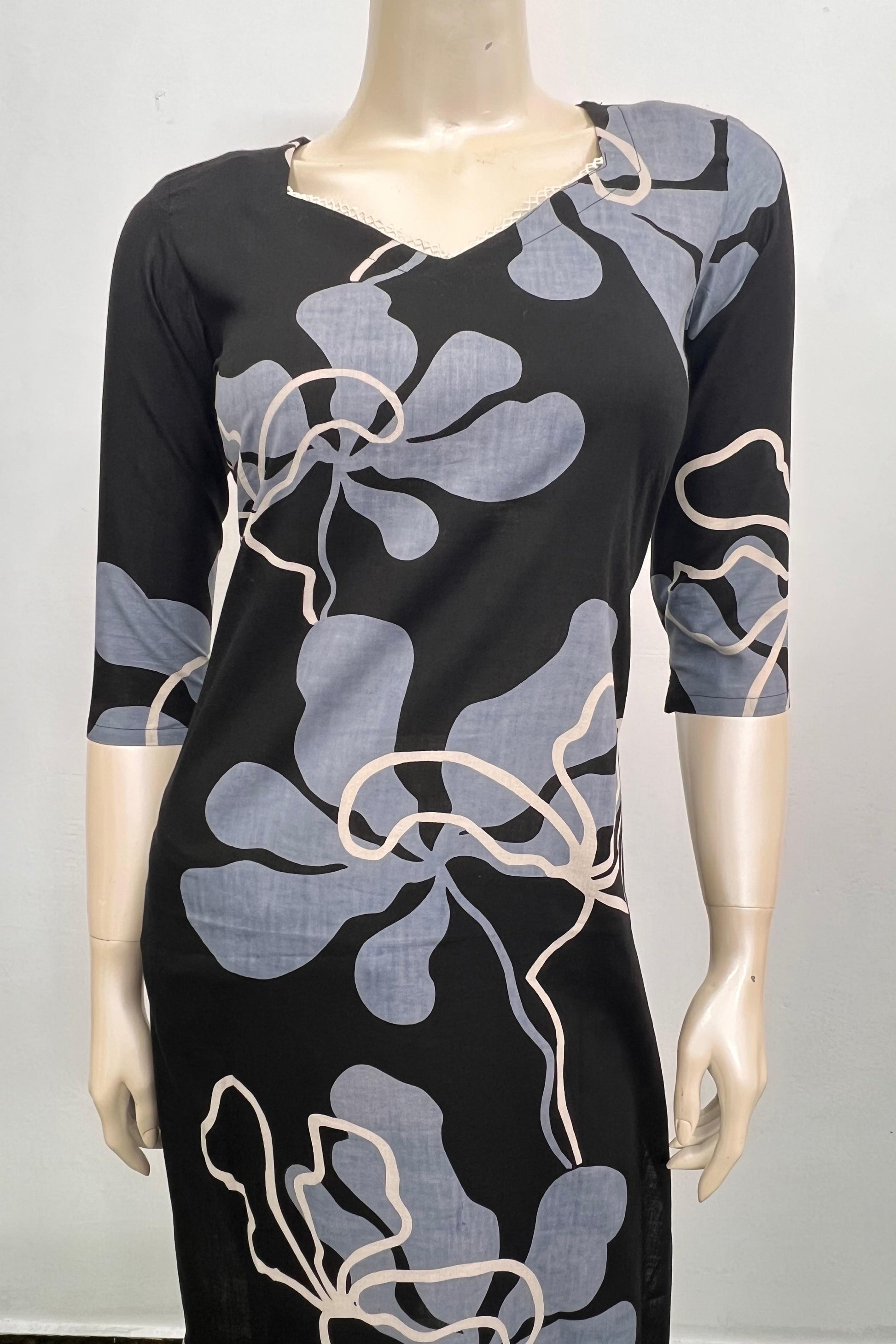 The daily wear cotton elegant kurti is in a shade of light grey and black pattern, predominant colour is black. The pattern consists of large stylized floral leaf shapes in a light grey colour, outlined with thin white lines. The neckline a combination of square and V pattern. It is made in pure cotton making it breathable and comfortable.