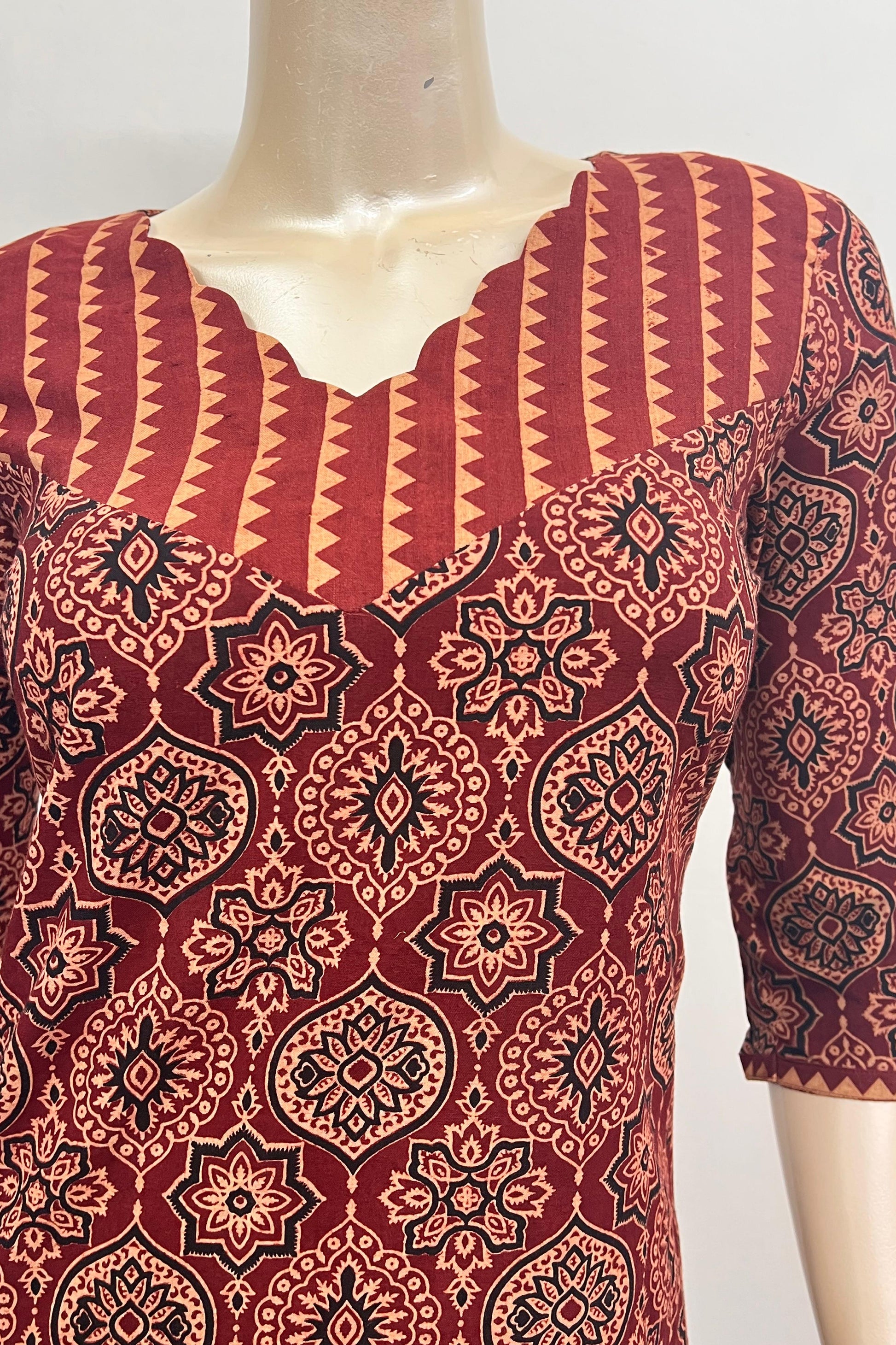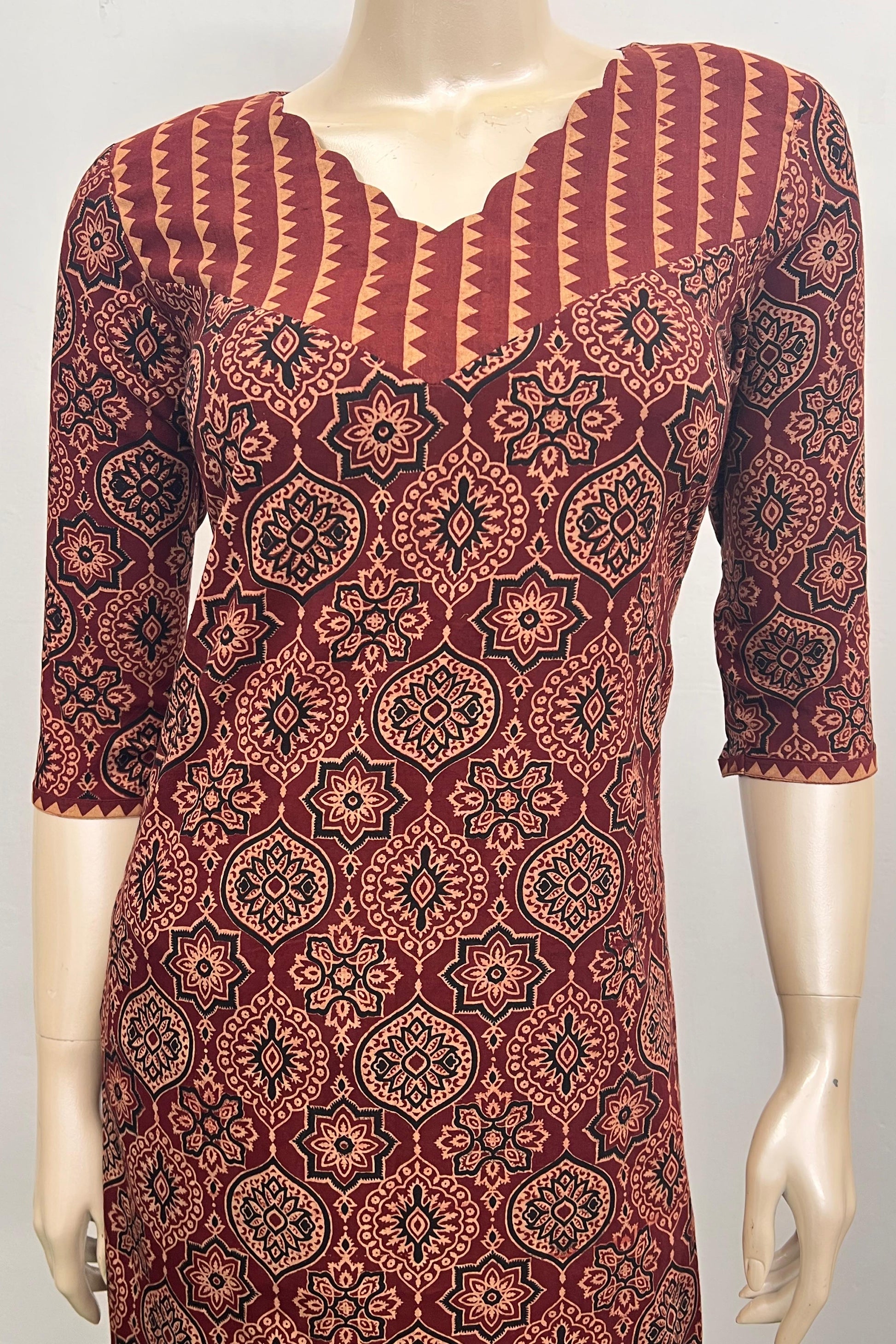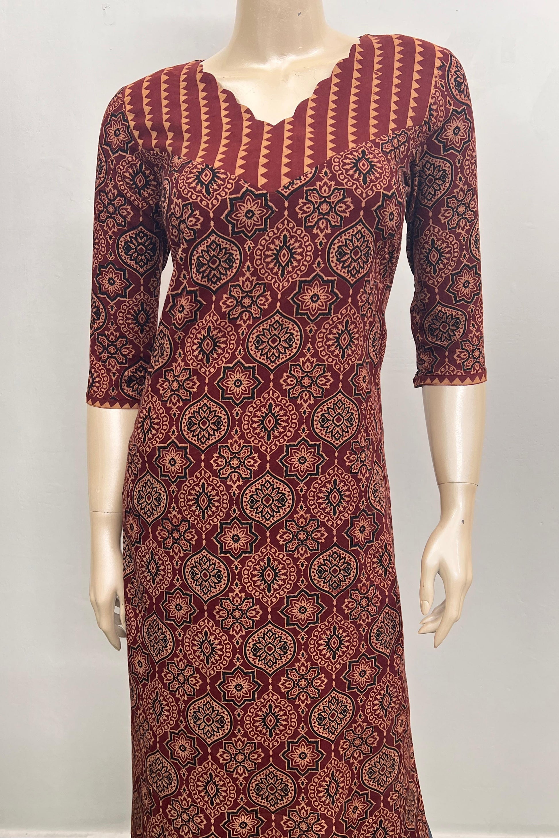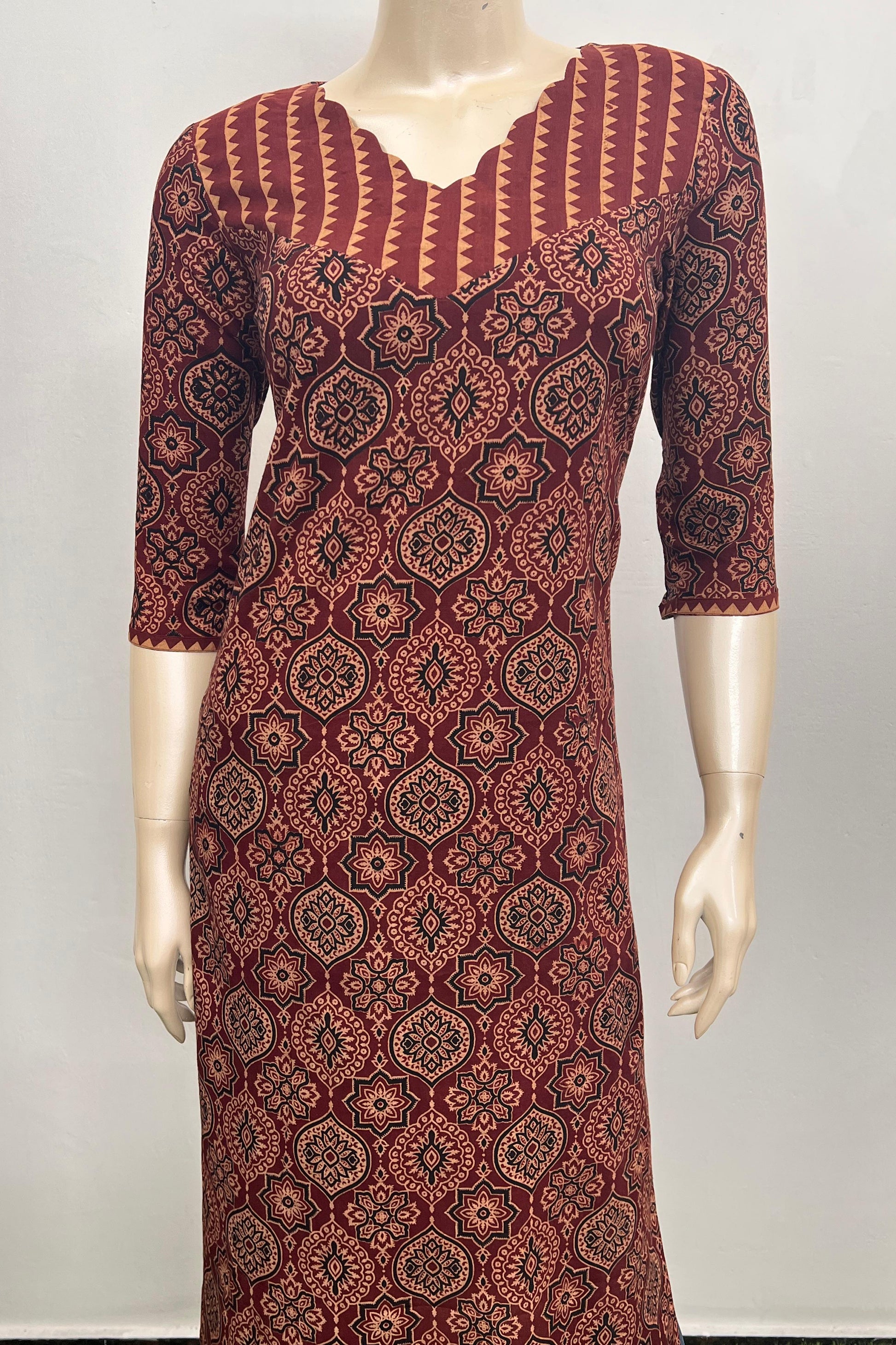 The dress is a long straight fit kurti in a reddish brown colour with an intricate repeating block printed pattern in black , beige and red. The pattern is characteristic of Ajrakh print, which is a traditional form of block printing. The neckline is a V neck with a distinctive scalloped edge. The yoke area around the neckline features a different block printed pattern with vertical stripes and a jagged border. It is made in pure cotton making it breathable and comfortable.