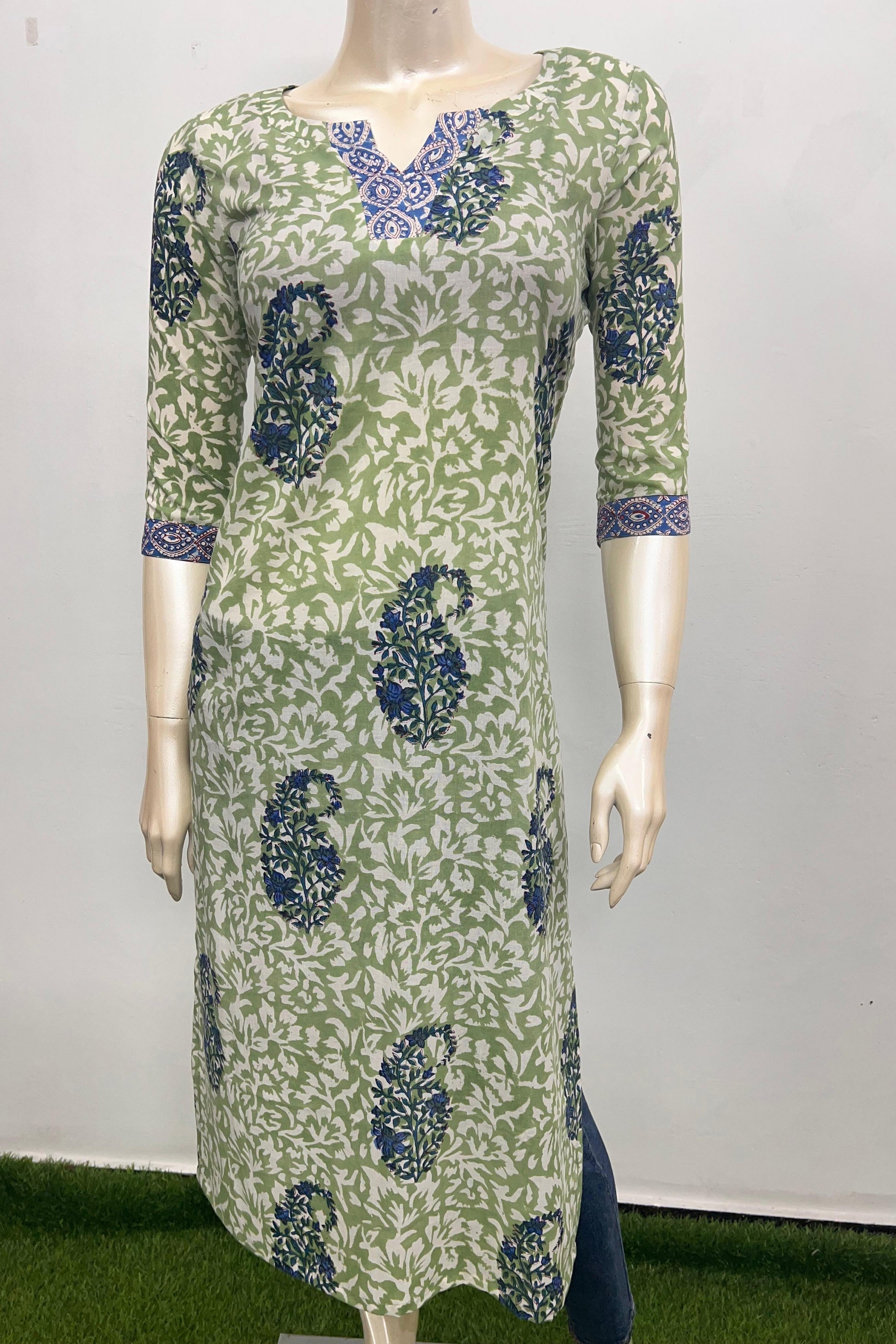 It is made in pure cotton making it breathable and comfortable. The distinctive patterns are created using the hand block printing technique, a centuries old art form where wooden blocks are used to stamp designs on fabric. This artisinal process often results in slight irregularities, which are considered a hallmark of authentic hand block prints.