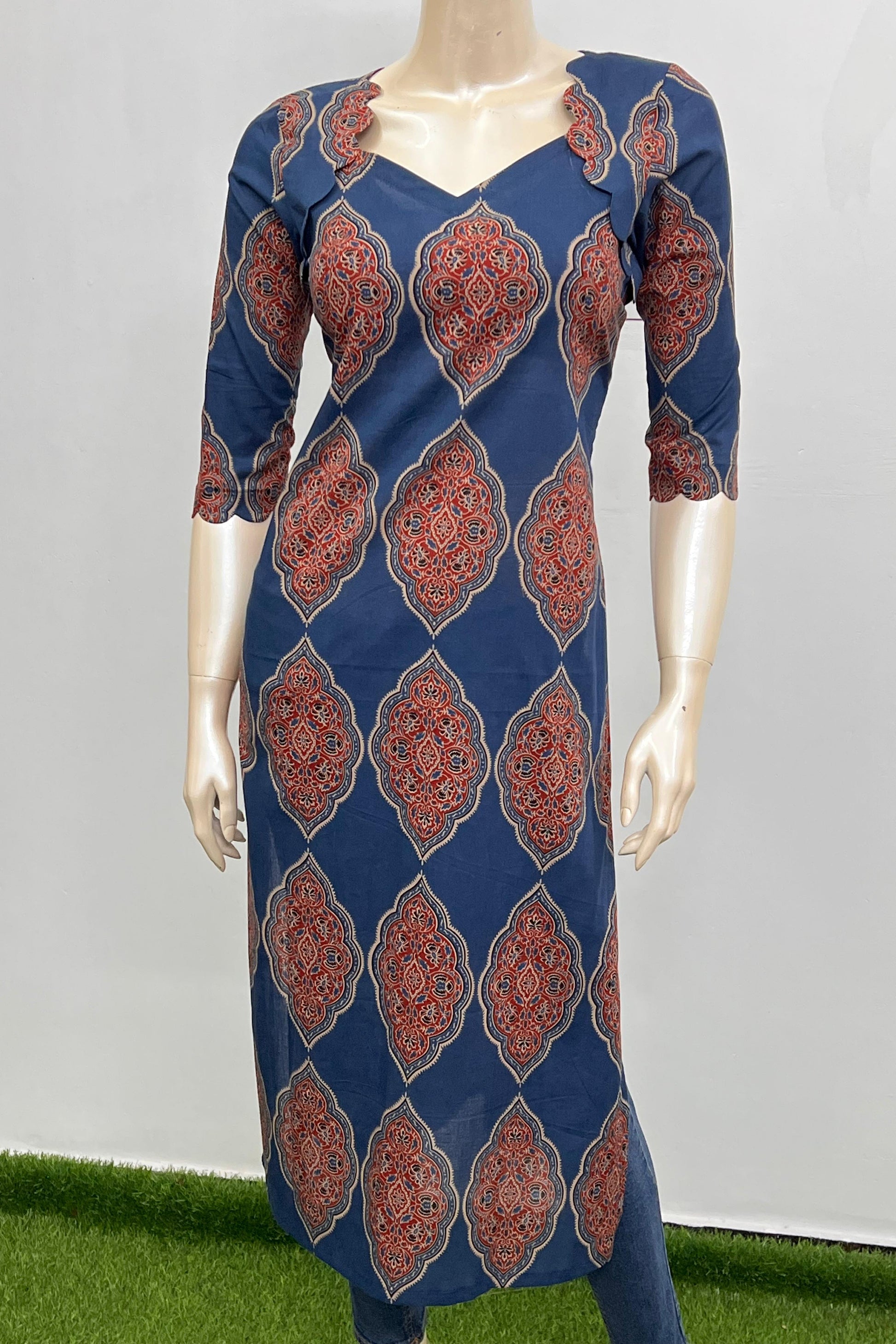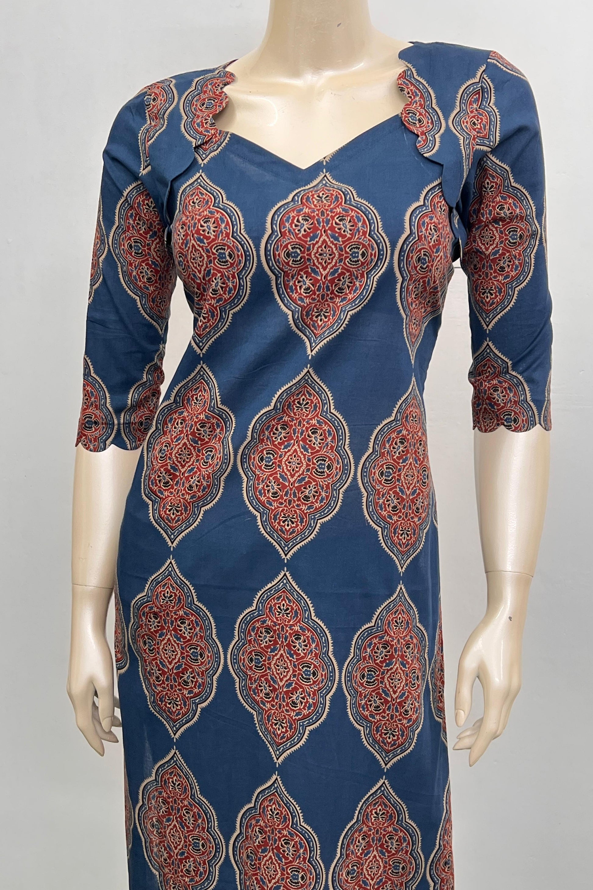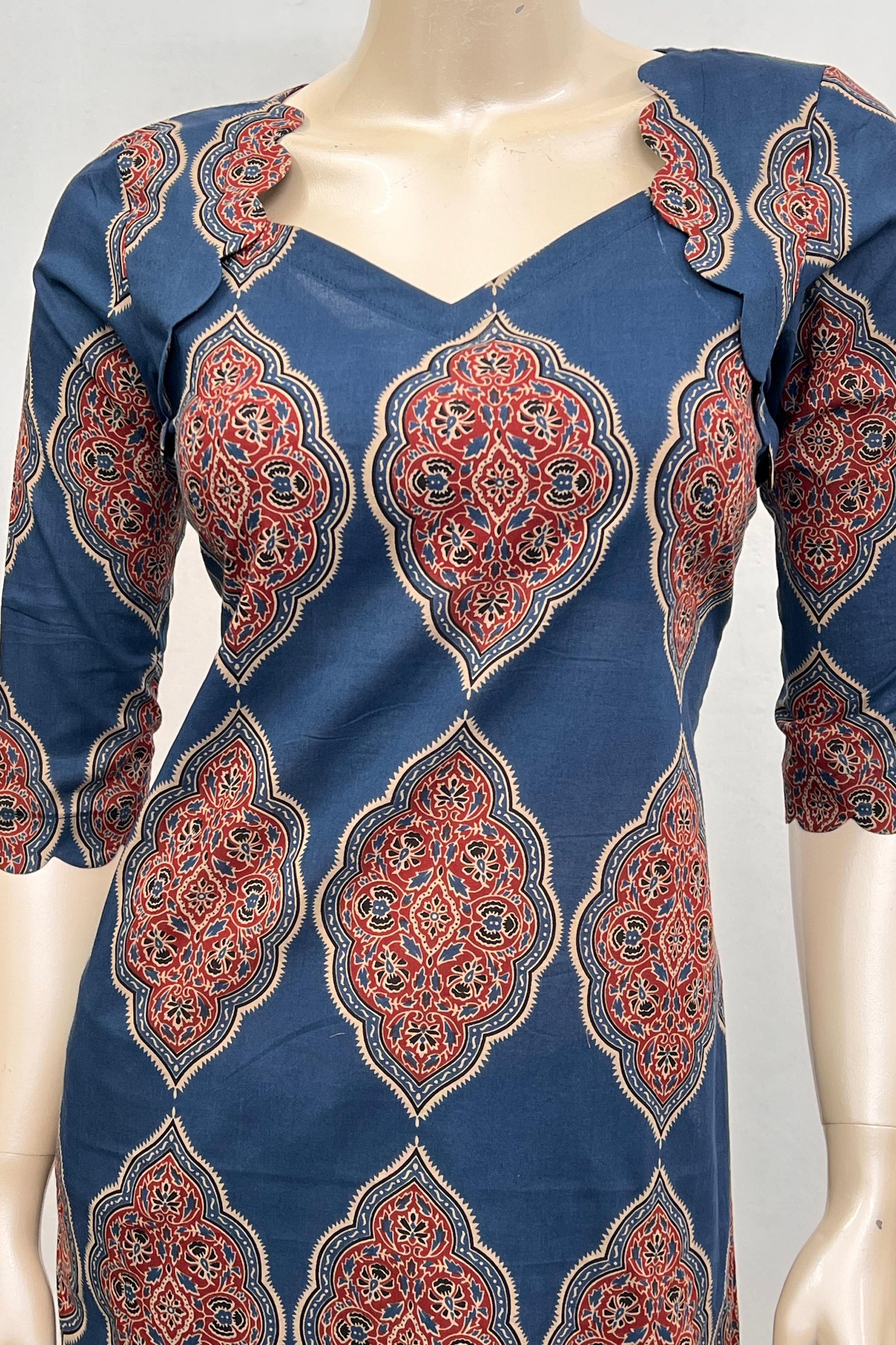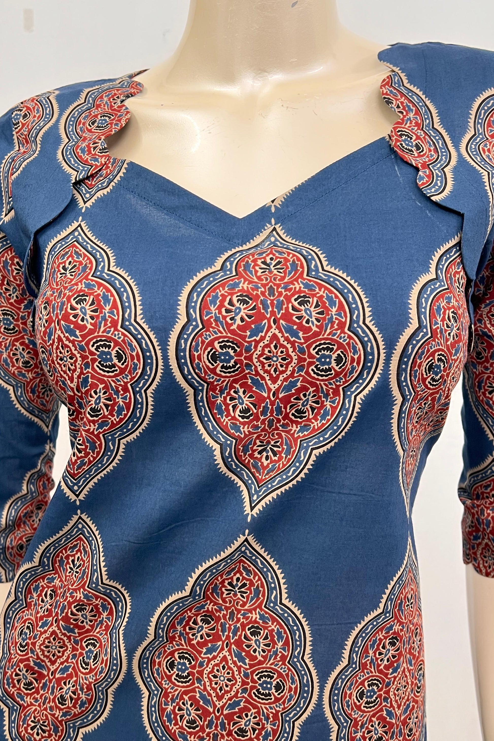 The dress is a blue cotton kurta featuring a distinctive red and beige geometric print with a large paisley pattern. A V-neck design with a unique, scalloped overlay detail that creates a decorative edge around the collar. Three-quarter length sleeves, also finished with a matching scalloped edge.