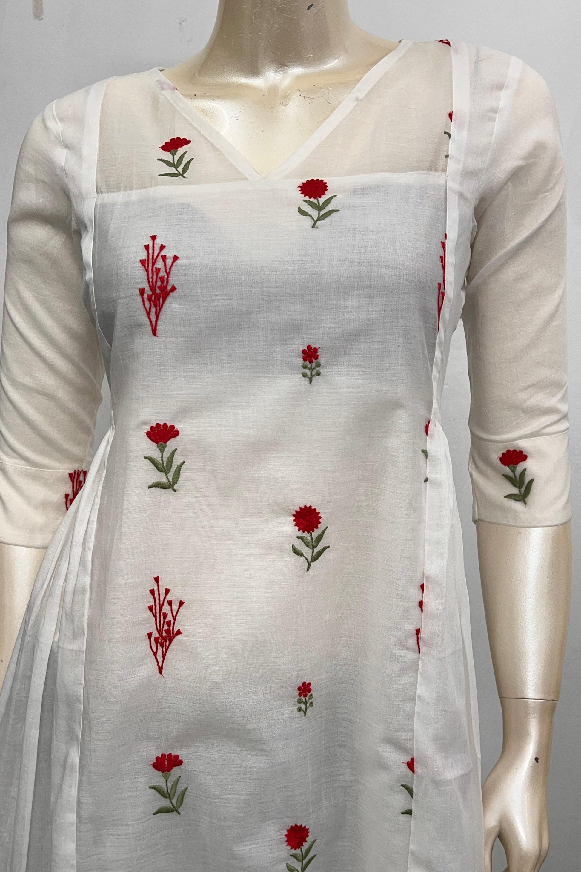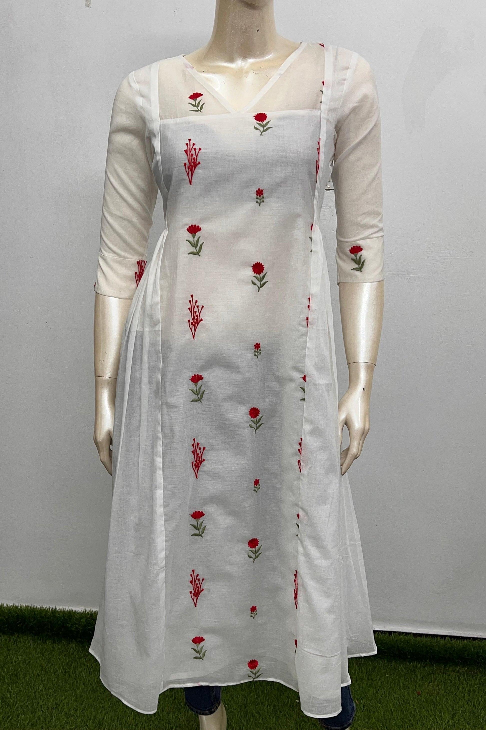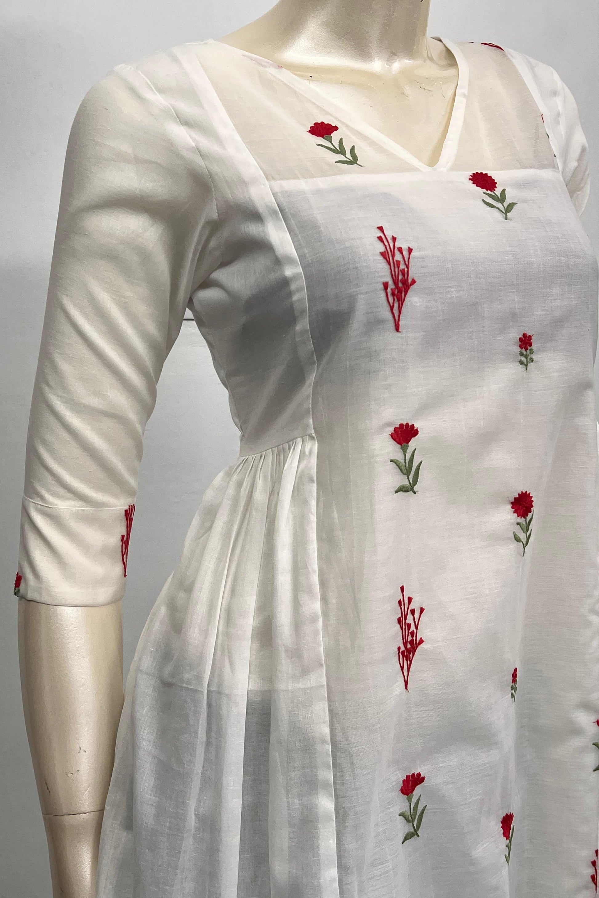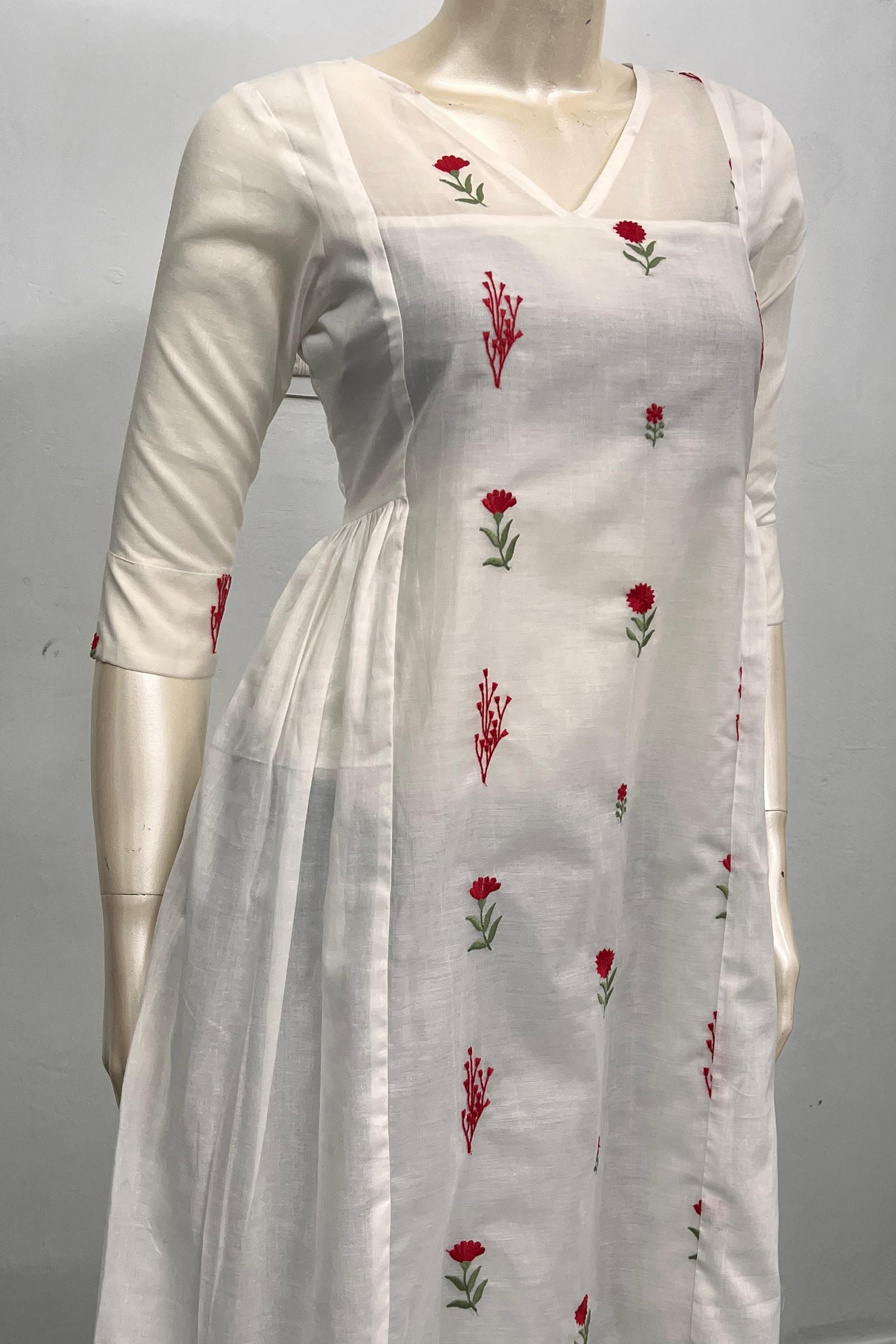 This dress is a white ethnic A line kurta featuring intricate red floral thread embroidery. It is adorned with detailed red thread work in floral and sprig motifs scattered across the front of the garment and on the sleeves.